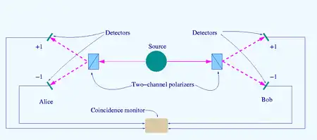 Las desigualdades de Bell son comprobadas por "contadores de coincidencias" de un experimento de prueba de Bell como el óptico mostrado en el diagrama. Los pares de partículas son emitidos como resultados de un proceso cuántico, analizados con respecto a alguna propiedad clave como la dirección de polarización, y entonces detectados. El ajuste (orientaciones) de los analizadores son seleccionados por el experimentador.