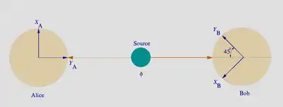 Ilustración del test de Bell para partículas de espín 1/2. La fuente produce pares de singlete de espín, una partícula de cada par es enviada a Alicia y la otra a Bob. Cada uno realizar una de las dos medidas de espín.