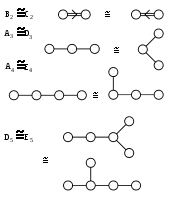 Trivialmente, se pueden comenzar las familias en o que son isomórficas, ya que existe un diagrama vacío único y un diagrama único de 1 nodo. Los otros isomorfismos de los diagramas de Dynkin conectados son: