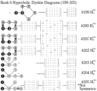 - los diagramas de Dynkin deben satisfacer una restricción adicional, a saber, que las únicas etiquetas de enlace permitidas son 2, 3, 4 y 6, una restricción que no comparten los diagramas de Coxeter, por lo que no todos los diagramas de Coxeter de un grupo finito provienen de un diagrama de Dynkin.