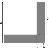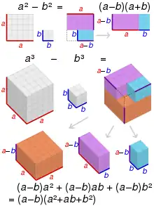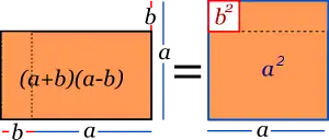 Otra prueba geométrica se desarrolla de la siguiente manera: se comienza con la figura que se muestra en el primer diagrama a continuación, un cuadrado grande al que se le quita un cuadrado más pequeño. El lado de todo el cuadrado es a, y el lado del pequeño cuadrado eliminado es b. El área de la región sombreada es . Se hace un corte, dividiendo la región en dos piezas rectangulares, como se muestra en el segundo diagrama. La pieza más grande, en la parte superior, tiene un ancho a y una altura a-b. La pieza más pequeña, en la parte inferior, tiene un ancho a-b y una altura b. Ahora la pieza más pequeña se puede separar, rotar y colocar a la derecha de la pieza más grande. En esta nueva disposición, que se muestra en el último diagrama a continuación, las dos piezas juntas forman un rectángulo, cuyo ancho es y cuya altura es . El área de este rectángulo es . Dado que este rectángulo proviene de reorganizar la figura original, debe tener la misma área que la figura original. Por lo tanto, .