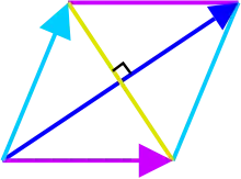 La demostración es idéntica. Para el caso especial de que a y b tengan normas iguales (lo que significa que los productos escalares por sí mismos de ambos vectores son iguales entre sí), esto demuestra analíticamente el hecho de que las dos diagonales de un rombo son perpendiculares entre sí. Esto se sigue de que el lado izquierdo de la ecuación es igual a cero, lo que requiere que el lado derecho también sea igual a cero, por lo que la suma vectorial de a + b (la diagonal larga del rombo) multiplicada escalarmente por la diferencia vectorial a - b (la diagonal corta del rombo) debe ser igual a cero, lo que indica que las diagonales son perpendiculares entre sí.