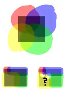 La parte inferior izquierda es un refinamiento de un recubrimiento (parte superior) de una forma plana (oscura) para que todos los puntos de la forma estén contenidos en un máximo de tres conjuntos. La parte inferior derecha es un intento de refinar el recubrimiento para que ningún punto quede contenido en más de dos conjuntos. Esto falla en la intersección de fronteras establecidas. Por lo tanto, una forma plana no es "tejida" o no puede recubrirse con "cadenas", porque en cierto sentido es más gruesa; es decir, su dimensión topológica debe ser superior a uno. |