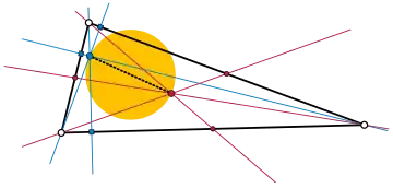 Guinand demostró en 1984 que el incentro del triángulo debe estar en el interior del círculo ortocentroidal, pero no coincidiendo con el centro de nueve puntos; es decir, debe caer en el "disco ortocentroidal" abierto perforado en el centro de nueve puntos.[1][2][3][4] [5]: pp. 451–452 El incentro puede ser cualquier punto del disco, dependiendo del triángulo específico que tenga ese círculo ortocentroidal particular.[3]