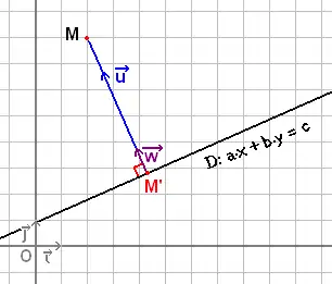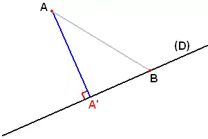 La distancia mínima se ubica en la proyección ortogonal del punto M sobre D, es decir, el punto M' de la recta D tal que (MM') sea perpendicular a ella. En efecto, si se toma otro punto cualquiera B de D, entonces en el triángulo rectángulo MM'B, la hipotenusa MB es más larga que el cateto MM'. Geométricamente, se construye el punto proyectado M' deslizando una escuadra sobre una regla que sigue la recta D hasta encontrar el punto M; luego se mide la longitud MM'.