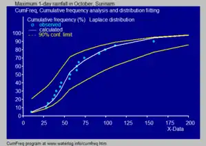 - En la hidrología, se utiliza la distribución de Laplace para analizar variables aleatorias como valores máximos de la precipitación y la descarga de ríos,[3] y además para describir épocas de sequía.[4]