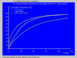 - La imagen azul ilustra un ejemplo de ajuste de la distribución exponencial a lluvias máximas diárias anuales ordenadas, mostrando también la franja de 90% de confianza, basada en la distribución binomial. Las observaciones presentan los marcadores de posición, como parte del análisis de frecuencia acumulada.