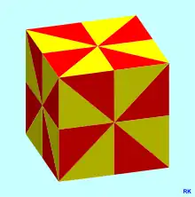 Es algo más complicado encontrar la forma geométrica del dominio fundamental de un cubo homogéneo. Un cubo homogéneo tiene 48 elementos de simetría, el elemento neutro, 23 elementos de simetría rotacional y reflexiones en 24 planos de simetría. El cubo se puede descomponer en sus 48 dominios fundamentales (equivalentes) haciendo cortes en los 24 planos de simetría especular. El resultado se muestra en la figura dominios fundamentales de un cubo homogéneo. Hay dos tipos de dominios fundamentales que son simétricos especularmente. Aunque tienen un color diferente, las propiedades (físicas) de los dos tipos son las mismas. Un dominio fundamental tiene la forma de un tetraedro (no regular). Sus aristas, que no son visibles en la imagen, van desde los puntos de las esquinas del triángulo rectángulo visible hasta el punto fijo de las operaciones de simetría, el centro del cubo.
