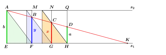 Mover en primer lugar el segundo triángulo (azul) hacia el punto para que su hipotenusa , la línea (roja) y la vertical se crucen en el punto . Solo en el siguiente paso, empujar el tercer triángulo (amarillo) de tal manera que su hipotenusa , la línea (roja) y la vertical se crucen en el punto . Las repeticiones de estos pasos generan las dos proporciones medias e