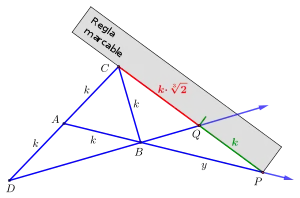 - Se marca la medida de la arista del cubo dado mediante un segmento de longitud , como se muestra en la Figura 1. Luego, se construye un triángulo equilátero con los vértices . Se duplica el segmento a partir de lo que da como resultado el punto Ahora, se extiende la línea recta desde , y se traza desde la semirrecta que pasa por . A continuación, se coloca una regla marcada con el punto situado de forma que la distancia desde la esquina al punto corresponde a según el dibujo. Para ello, se debe girar y deslizar la regla hasta que su esquina esté situada sobre la extensión de la línea recta , el punto esté en la extensión de la línea recta y el borde de la regla pase por el punto . Finalmente, conectar el punto con