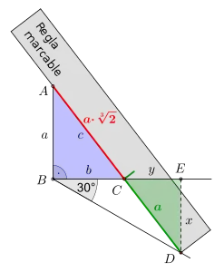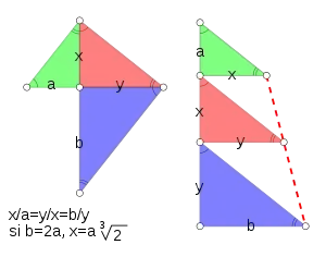 El uso de las dos herramientas mecánicas que se describen a continuación proporciona las llamadas dos medias proporcionales e establecidas por Hipócrates de Quíos[30] para duplicar el cubo inicial de longitud de arista . La media proporcional corresponde a la longitud de arista buscada del cubo duplicado, .