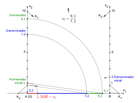 Primero, la fracción para trabajar en una unidad manejable, como centímetros, se escala en el cociente decimal (aunque se podría trabajar directamente en milímetros) y luego se marca su cociente exacto en un eje de coordenadas (Fig. 1). Para este propósito, por ejemplo, se puede utilizar el teorema de Tales. Debido a las proporciones tan diferentes entre las distintas cantidades, es conveniente mostrar este proceso en su propia imagen.