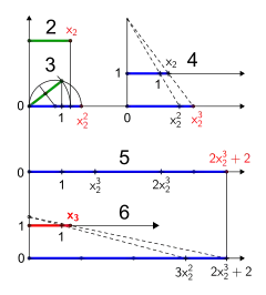 En el siguiente paso, la longitud (rojo) de la Figura 1 se transfiere a la Figura 2 (verde, número 2). Luego se determinan el cuadrado (número 3) y el número cúbico (número 4) de En el quinto paso, el número cúbico de se multiplica por el factor y se suma el número . Finalmente (número 6) se determina el cociente (rojo):