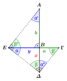 Debido al paralelismo y a los cuatro ángulos rectos en el vértice , los siguientes triángulos tienen los mismos ángulos y, por lo tanto, son semejantes entre sí: