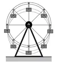 Las trayectorias recorridas por los distintos puntos del cuerpo pueden ser circunferencias, todas ellas del mismo radio (congruentes), aunque de distinto centro. Esta situación se presenta en una noria de feria de eje horizontal, como se muestra en la figura: la armadura de la noria gira en torno al eje (rotación), pero las barquillas suspendidas de dicha armadura, prescindiendo de pequeñas oscilaciones pendulares, experimentan una traslación con trayectorias circulares.