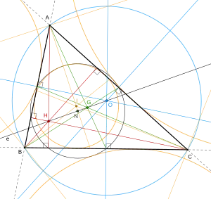 Un triángulo escaleno (ΔABC) con el centro de gravedad (G), el centro del círculo inscrito (I), el centro del círculo circunscrito (O) y el ortocentro (H)