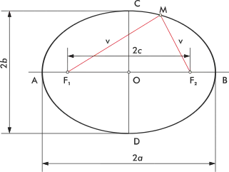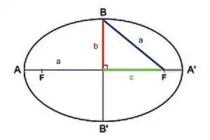 - El diámetro mayor de la elipse se suele designar 2a, siendo a el semieje mayor. El semieje menor se denomina b y el diámetro menor 2b. La distancia de cada foco al centro se denomina c.