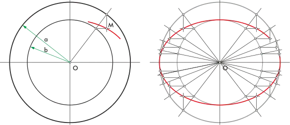 Partimos de las rectas de los ejes principales. Se dibujan dos circunferencias concéntricas cuyos diámetros sean los de la elipse. Para hallar un punto trazamos un radio cualquiera de la circunferencia mayor fuera de los ejes. Desde el extremo del radio trazamos una recta auxiliar, paralela al eje menor, hacia dentro de la circunferencia. Desde el punto donde el radio corta la circunferencia menor trazamos una recta auxiliar paralela al eje mayor, que cruce la línea auxiliar que acabamos de hacer. El punto donde se cortan las dos auxiliares pertenece a la elipse.