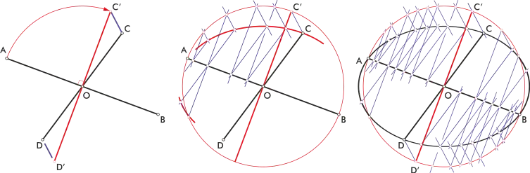 A partir de dos diámetros conjugados (A-B y C-D) se puede realizar la siguiente construcción, en la que hacemos afines los extremos del diámetro conjugado menor (C y C', la línea de afinidad en azul) con el de una circunferencia auxiliar de diámetro igual al mayor y perpendicular a él (en rojo), mientras el diámetro mayor es el eje de afinidad. Cada punto de la circunferencia es afín a otro de la elipse.