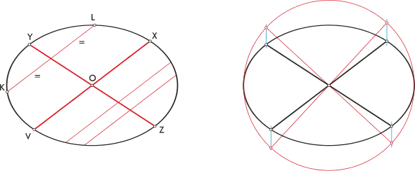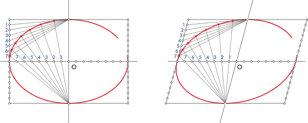 En la segunda imagen vemos el mismo procedimiento aplicado a dos diámetros conjugados; el rectángulo se hace romboide, pero sigue funcionando la construcción como una proyección afín de la otra.