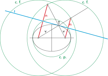 - Los puntos donde se cruzan las normales con sus tangentes son los pies de la tangente. Ese punto pertenece siempre a la circunferencia principal. Al doble de la distancia de F al pie se encuentra el corte de la normal con la circunferencia focal del foco opuesto. Está forma un círculo oblicuo que toma 2 puntos en cualquier parte de la recta