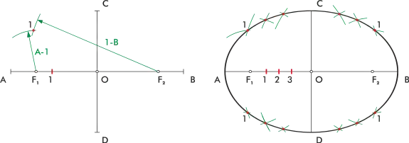 Tomamos con el compás la distancia de un extremo del eje mayor (A) a cada uno de los puntos del eje (1). Haciendo centro en cada foco trazamos arcos con esa medida. A continuación tomamos el resto de la medida del eje mayor, desde el punto (1) al otro extremo (B), y con esa medida, haciendo centro de nuevo en los focos, cruzamos los arcos trazados antes. Las cruces nos dan puntos que pertenecen a la elipse.