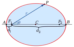 Para ambas ecuaciones a es el semieje mayor, b es el semieje menor de la elipse, θ es el ángulo polar y para la () ε es la excentricidad.