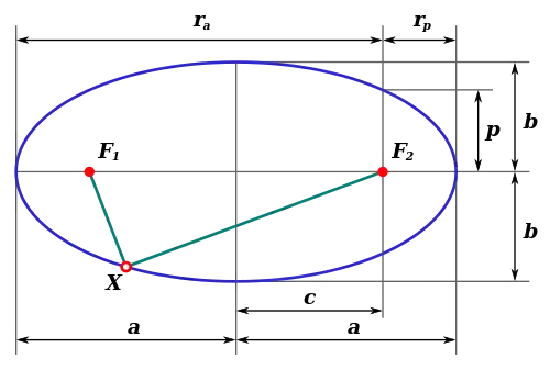 En la imagen de la derecha vemos algunas otras líneas y puntos importantes de la elipse.