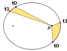 En la figura pueden verse dos intervalos de tiempo distintos de una órbita elíptica que cumplen la segunda ley de Kepler: "en tiempos iguales una masa en órbita barre con su radio vector áreas iguales". Cuando el "planeta" está más cerca de la "estrella" va más rápido y cuando está lejos va más despacio,[10] pero de tal manera que su velocidad areolar es la misma en ambos casos. Esto significa que las áreas de los sectores elípticos amarillos son iguales y sus arcos t0 t1 se han recorrido en intervalos de tiempo iguales, Δt = t1 - t0. La "estrella" está situada en P, uno de los focos de la elipse.