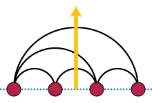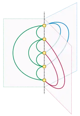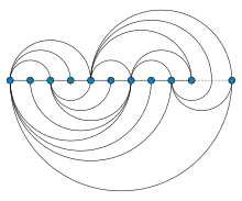 Un diagrama de arcos[52] o embebido lineal[42] coloca los vértices de un grafo en una recta y dibuja los vínculos del grafo como semicírculos por encima o por debajo de esta línea, y a veces también se permite dibujar vínculos en segmentos sobre la propia línea recta. Este estilo de dibujo corresponde a un embebido en libro con una página (si todos los semicírculos están situados por encima de la recta) o dos páginas (si se usan ambos lados de la recta), y se introdujo originalmente como una forma de estudiar los números de cruces de los grafos.[56][57] Los grafos planos que no tienen embebidos en libro de dos páginas también se pueden dibujar de manera similar, al permitir que sus vínculos se representen mediante varios semicírculos por encima y por debajo de la línea recta. Tal dibujo no es un embebido de libro según la definición habitual, pero se ha denominado embebido de libro topológico.[58] Para cada grafo plano, siempre es posible encontrar un embebido en el que cada vínculo cruce la recta donde se sitúan los vértices como máximo una vez.[59]