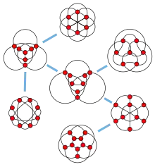 También se pueden definir familias de grafos por la presencia o ausencia de nudos y enlaces más complejos en sus embebidos,[13] o por embebidos sin enlaces en variedades tridimensionales que no sean el espacio euclídeo.[14]Flapan, Naimi y Pommersheim (2001) define un grafo embebido como triplemente enlazado si posee tres ciclos, ninguno de los cuales puede separarse de los otros dos; y demostraron que K9 no tiene un triple enlace intrínseco, pero K10 sí que lo tiene.[15] De manera más general, se puede definir un embedido n-enlazado para cualquier n como aquel que contiene un enlace de componente n que no puede dividirse mediante una esfera topológica en dos partes separadas. Se conocen grafos menores-mínimos intrínsecamente n-enlazados para todo n.[16]