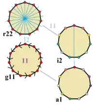 John Conway clasificó estas simetrías usando una letra y el orden de la simetría a continuación. Asignó la letra r al grupo de simetría de la figura regular; y en el caso de los subgrupos utilizó la letra d (de diagonal) para las figuras con ejes de simetría solo a través de sus vértices; p para figuras con ejes de simetría solo a través de ejes perpendiculares a sus lados; i para figuras con ejes de simetría tanto a través de vértices como a través de centros de lados; y g para aquellas figuras solo con simetría rotacional. Con a1 se etiquetan aquellas figuras con ausencia de simetría. Los tipos de simetrías más bajos permiten disponer de uno o más grados de libertad para definir distintas figuras irregulares.[11] Solo el subgrupo g11 no tiene grados de libertad, pero puede verse como un grafo dirigido. (Véase un ejemplo en la Teoría de grupos de John Conway)