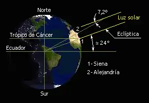 Por referencias obtenidas de un papiro de su biblioteca, sabía que en Siena (hoy Asuán, Egipto) el día del solsticio de verano los objetos verticales no proyectaban sombra alguna y la luz alumbraba el fondo de los pozos; esto significaba que la ciudad estaba situada justamente sobre la línea del trópico de Cáncer, y su latitud era igual a la de la eclíptica que ya conocía. Eratóstenes, suponiendo que Siena y Alejandría tenían la misma longitud (realmente distan 3°) y que el Sol se encontraba tan alejado de la Tierra que sus rayos podían suponerse paralelos, midió la sombra en Alejandría el mismo día del solsticio de verano al mediodía, demostrando que el cenit de la ciudad distaba 1/50 parte de la circunferencia, es decir, 7° 12' del de Alejandría. Según Cleomedes, Eratóstenes se sirvió del scaphium o gnomon (un protocuadrante solar) para el cálculo de dicha cantidad.