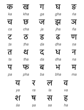 Las svara y las vyanjana se ordenan y agrupan lógicamente para su estudio o recitación. Así, los sonidos puros, 'a', 'i', 'u' y sus versiones alargadas ('aa', 'ii', 'uu') son seguidos por las formas combinadas ('ae', 'ai', 'o', 'ou'), nasales ('.m') y aspiradas ('.h'). Las vyanjana en sí se agrupan en seis grupos (filas) de cinco miembros (columnas). Las primeras cinco filas progresan en el sentido velar, palatal, retrofleja, dental y labial, en correspondencia con el uso de la lengua hacia partes cada vez más externas al hacer el sonido. Las vyanjana restantes son técnicamente sonoras, sibilantes, o ampliamente usadas como formas conjuntas. Para cada fila o grupo, las columnas avanzan lógicamente hacia sonidos más suaves, apareados con las formas aspiradas, y finalizando con la forma nasal para dicho grupo.