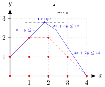 Aquí, el conjunto factible es el conjunto de pares en el que el valor de es al menos 1 y como máximo 10 y el valor de es al menos 5 y como máximo 12. Tenga en cuenta que el conjunto factible del problema está separado de la función objetivo, que establece el criterio a optimizar y que en el ejemplo anterior es