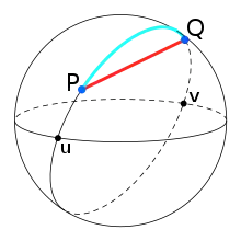 Diagrama que ilustra la distancia ortodrómica (en verde) y la distancia rectilínea (en rojo) entre dos puntos P y Q de una esfera.