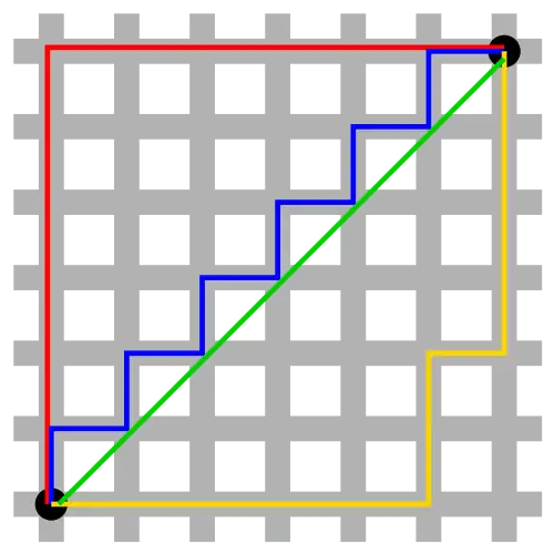 El plano (un conjunto de puntos) puede estar dotado de diferentes métricas. En la métrica del taxi los caminos rojo, amarillo y azul tienen la misma longitud (12), y son todos caminos más cortos. En la métrica euclídea, el camino verde tiene longitud <, y es el único camino más corto, mientras que los caminos rojo, amarillo y azul siguen teniendo longitud 12.