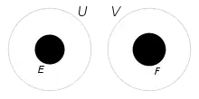 Los conjuntos cerrados E y F, aquí representados mediante discos cerrados en lados opuestos de la imagen, están separados por sus respectivos entornos U y V, aquí representados por discos abiertos mayores pero aún disjuntos.