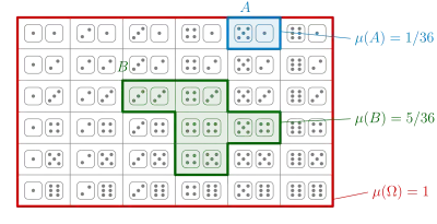Si p(ω) = 0 para todo ω ∈ Ω (en este caso, Ω debe ser incontable, porque si no P(Ω) = 1 no podría satisfacerse), entonces la ecuación (⁎) falla: la probabilidad de un conjunto no es necesariamente la suma sobre las probabilidades de sus elementos, ya que la suma sólo está definida para números contables de elementos. Esto hace que la teoría del espacio de probabilidad sea mucho más técnica. Se aplica una formulación más fuerte que la suma, la teoría de la medida. Inicialmente, las probabilidades se atribuyen a algunos conjuntos "generadores" (véanse los ejemplos). A continuación, un procedimiento de limitación permite asignar probabilidades a conjuntos que son límites de secuencias de conjuntos generadores, o límites de límites, y así sucesivamente. Todos estos conjuntos son la σ-álgebra . Los conjuntos pertenecientes a se llaman medibles. En general son mucho más complicados que los conjuntos generadores, pero mucho mejores que los conjuntos no medibles.