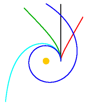 Debe admitirse que no todas las curvas se ajustan a la definición habitual de espiral. Por ejemplo, cuando la fuerza del cubo inverso es centrífuga (dirigida hacia afuera), de modo que μ < 0, la curva ni siquiera gira una vez sobre el centro. Esto está representado por el Caso 5, la primera de las ecuaciones polares que se muestran arriba, con k > 1 en este caso.