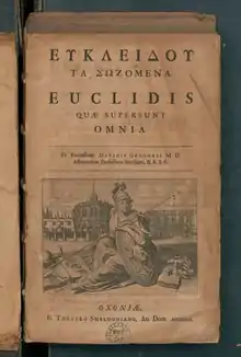- La primera edición de la época moderna de las obras de Euclides en griego fue la de David Gregory en Oxford (1703), con una traducción en latín. François Peyrard hizo una edición trilingüe en 3 volúmenes (griego, latín y francés) de los Elementos y de Fecha (es decir, de todos los textos de Euclides de matemáticas puras conocidos en griego) en París (1814-1818).