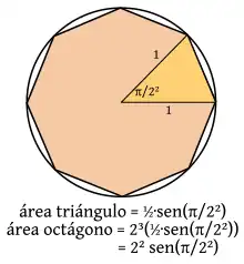 El proceso consiste en inscribir, en un círculo de radio 1, polígonos regulares de lados de modo que la sucesión de las áreas resulta una aproximación sucesiva al área del círculo, igual a π.