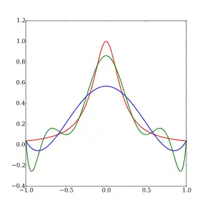 con un polinomio de grado , la interpolación resultante oscila hacia los extremos del intervalo, es decir, cerca de −1 y 1. Incluso se puede probar que el error de interpolación tiende a infinito cuando crece el grado del polinomio: