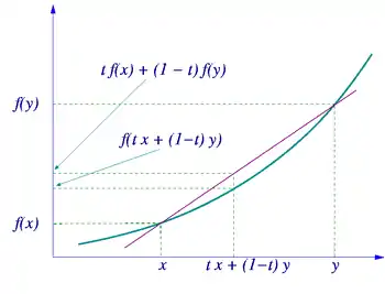 Una función real f definida en un intervalo (o en cualquier subconjunto convexo de algún espacio vectorial) se llama función convexa si está definida sobre un conjunto convexo C y para cualesquiera dos puntos x, y miembros de C, y para cada t en [0,1], se cumple que: