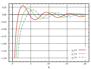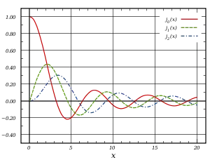 Las funciones de Bessel son funciones oscilatorias (como las funciones seno o coseno) que decaen proporcionalmente a , como se muestra en el gráfico anexo en la forma asintótica de estas funciones, aunque los ceros de estas funciones no son, en general, periódicos, excepto de forma asintótica para grandes valores de .