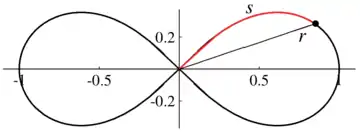 La función seno lemniscático es la recíproca de la integral anterior, y permite calcular para cada punto de la curva su distancia r desde el origen en función de la longitud de su arco desde el origen s. De manera similar, la función coseno lemniscático da la distancia desde el origen, en función de la longitud del arco desde (1, 0).
