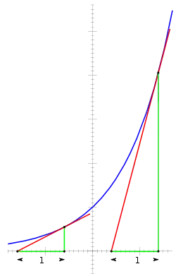 La derivada de la función exponencial es igual al valor de la función. Desde cualquier punto P en la curva (azul), dibuje una línea tangente (roja) y una línea vertical (verde) con altura h, formando un triángulo rectángulo con una base b en el eje x. Dado que la pendiente de la línea tangente roja (la derivada) en P es igual a la relación entre la altura del triángulo y la base del triángulo (aumento sobre la ejecución), y la derivada es igual al valor de la función, h debe ser igual a la relación de h a b. Por lo tanto, la base b siempre debe ser 1.