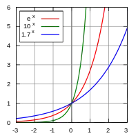 Su omnipresente aparición en matemáticas puras y aplicadas ha llevado al matemático W. Rudin a opinar que la función exponencial es "la función más importante en matemáticas".[3] En los ajustes aplicados, las funciones exponenciales modelan una relación en la que un cambio constante en la variable independiente proporciona el mismo cambio proporcional (es decir, aumento o disminución de porcentaje) en la variable dependiente. Esto ocurre ampliamente en las ciencias naturales y sociales; por lo tanto, la función exponencial también aparece en una variedad de contextos dentro de la física, la química, la ingeniería, la biología matemática y la economía.
