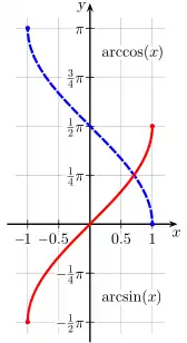 | arco coseno | y = arccos(x) | x = cos(y) | −1 ≤ x ≤ 1 | 0 ≤ y ≤ π | 0° ≤ y ≤ 180° |
