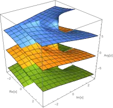 donde la parte del eje imaginario que no se encuentra estrictamente entre los puntos de ramificación (−iy + i) es el corte de rama entre la superficie principal y las otras. La trayectoria de la integral no debe cruzar un corte de rama. Cuandoz no está en una corte de rama, una ruta en línea recta de 0 a z es una ruta de este tipo. Para z en un corte de rama, el camino debe acercarse desde Re[x] > 0 para la corte de rama superior y desde Re[x] < 0 para el corte de rama inferior.